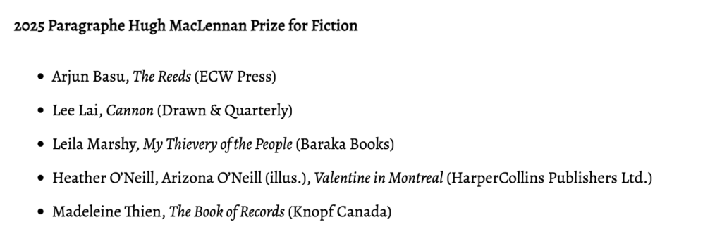 Yesterday it was announced that The Reeds is up for the Paragraphe Hugh MacLennan Prize for Fiction, an award run by the Quebec Writers Federation. It is somewhat gratifying to be up for a local prize for what may well be my most local book, one where the city of Montreal itself plays a large role in the story. Some reviews have noted this (though not all) and, well, that’s a strong list of writers I’m up against (I hate to put it in these terms)